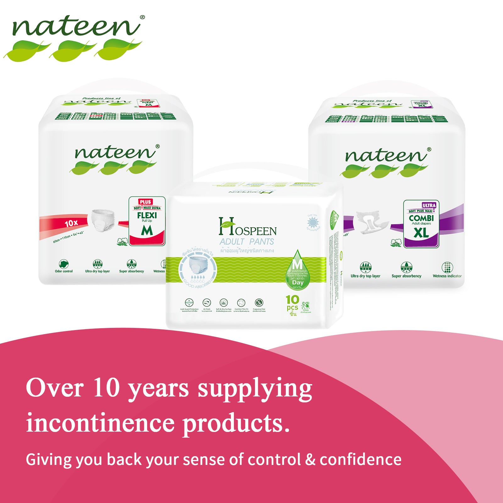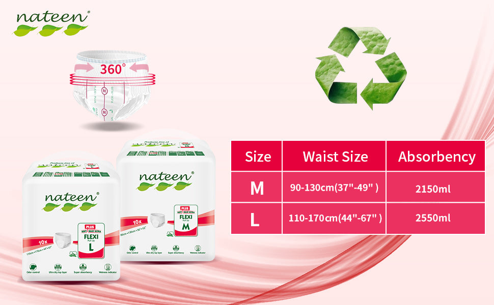 Nateen Flexi Plus Adult Diapers Pants,Incontinence Pull Up,Large,Waist Size 110-170cm,10 Count Adult Pull Ups,Superior Comfort,Excellent Combination of Protection.